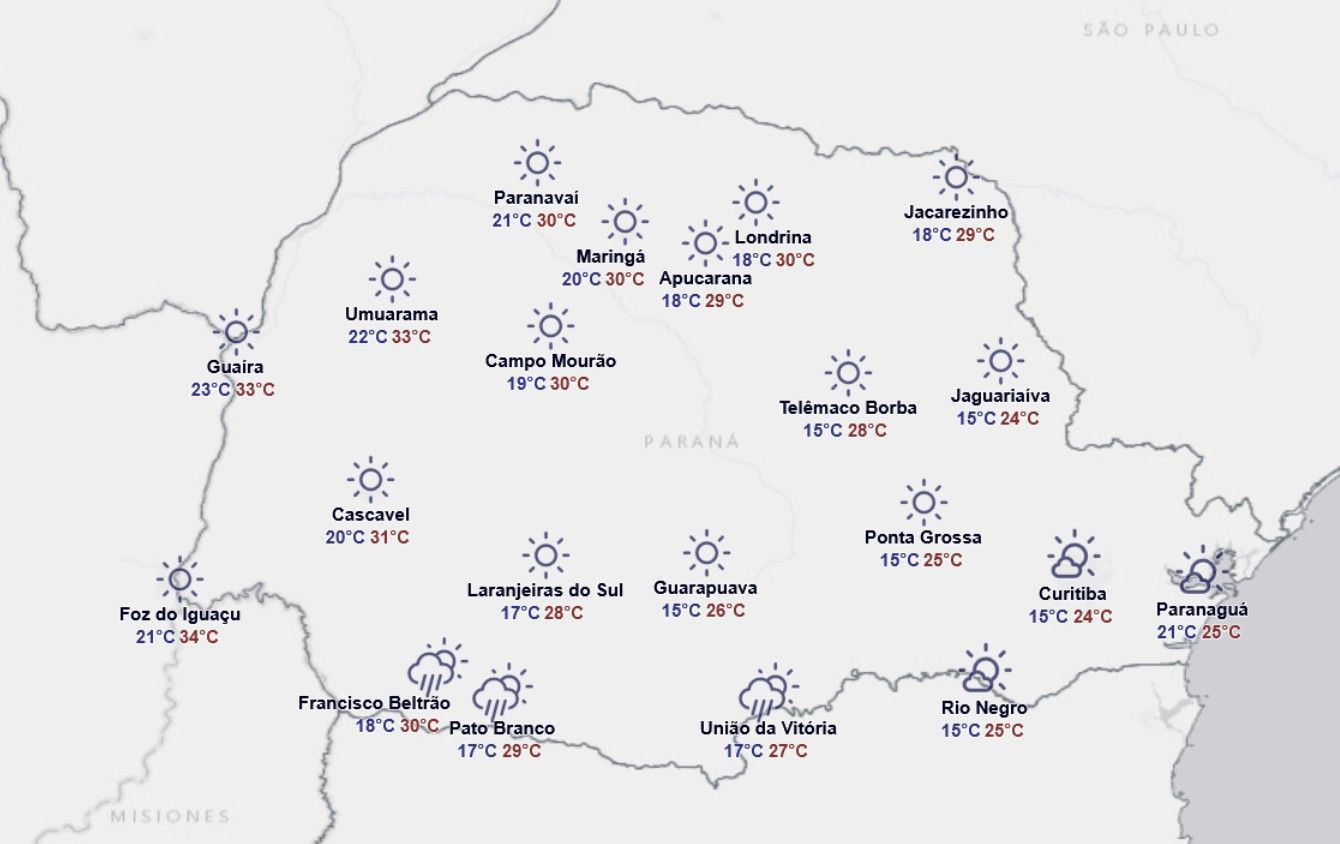 Nas outras regiões paranaenses o sol predomina e as temperaturas sobem rapidamente, chegando aos 33°C principalmente no Noroeste.